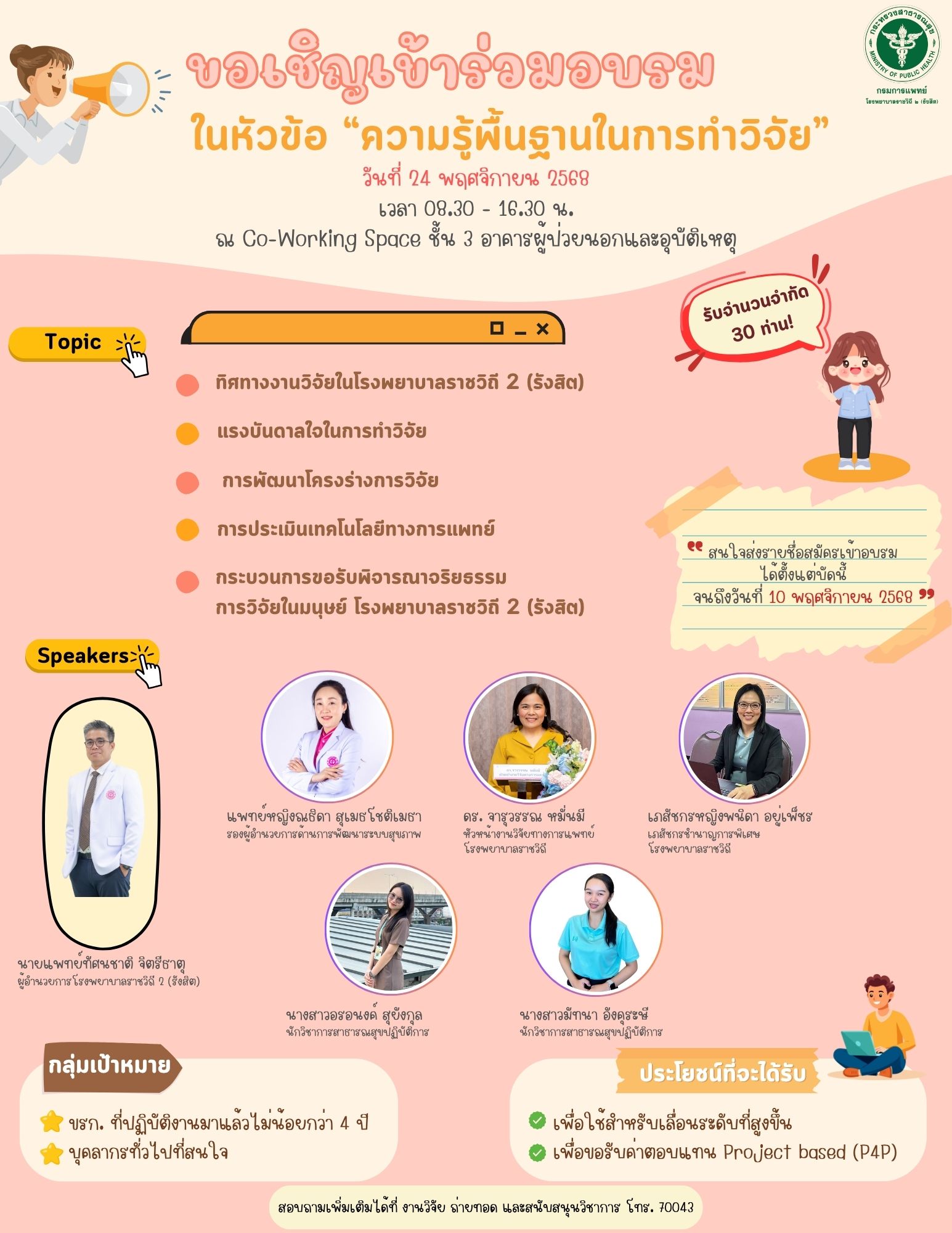 ประชาสัมพันธ์ ขอเชิญผู้ที่สนใจเข้าร่วมอบรม "ความรู้พื้นฐานในการทำวิจัย"