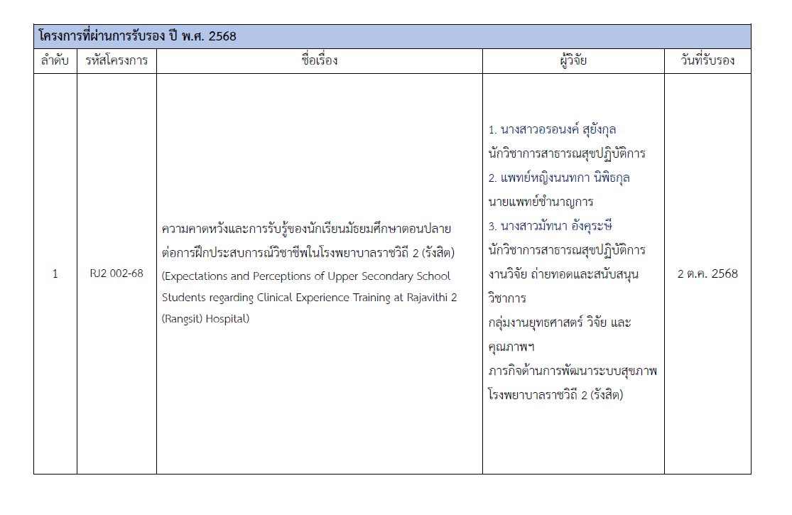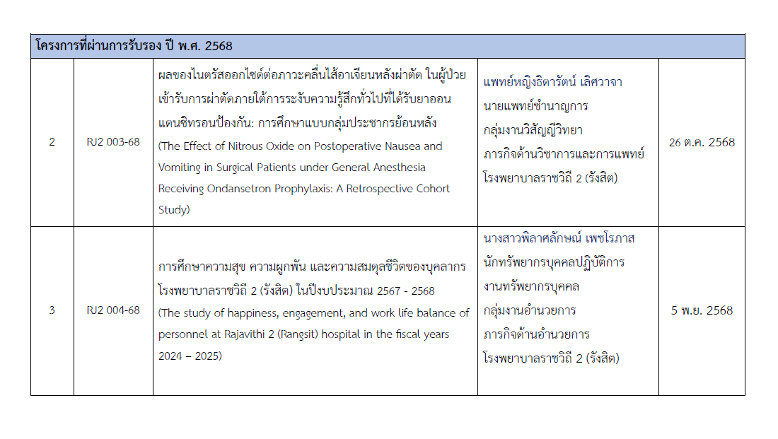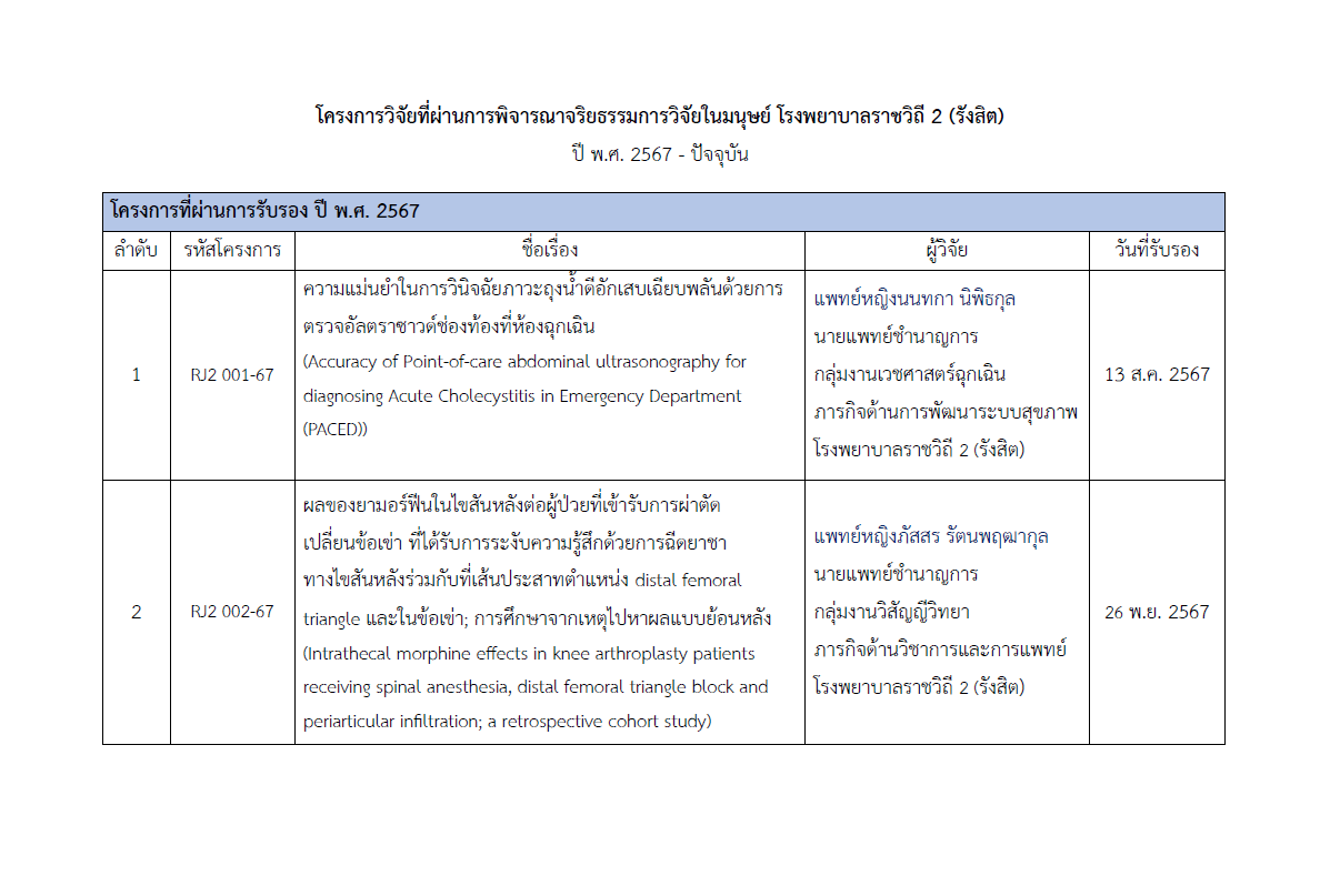 โครงการวิจัยที่ผ่านการรับรองจากคณะกรรมการจริยธรรมการวิจัยในมนุษย์ โรงพยาบาลราชวิถี 2 (รังสิต)
